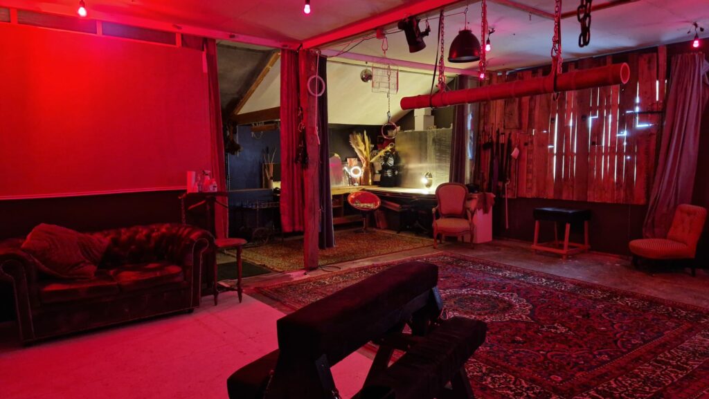 Le donjon, au fond le coin vestiaire et accessoires, le banc à fessée devant et le canapé pour regarder ou se reposer.